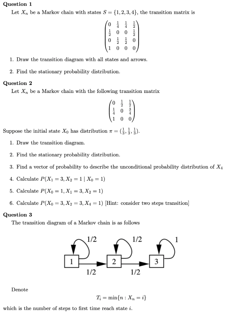 Markov Chains Solutions Consider the Markov chain X0 X1 X2. Exercise 223 Transition matrix for some physical process Write the transition matrix of the following Markov chains. 0 1 0 13 13 13 05 05 0 has a Draw the transition diagram of the Markov chain.